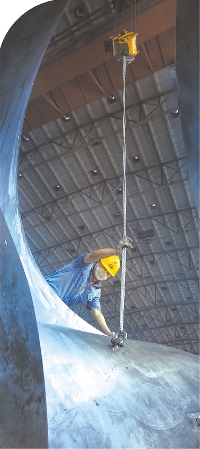 工人正在對白鶴灘水電站百萬千瓦水電機組轉輪葉片進行裝配作業。白鶴灘機組精品標準要求的磁軛中心偏差為0.15毫米,疊裝形成的磁軛中心相對理論中心偏差不超過0.02毫米,遠優于精品標準要求。(東方電氣集團供圖)