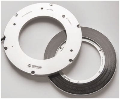 RAE170—1000分體絕對式圓時柵角位移傳感器。納米時柵測量技術主要應用于高檔數控機床、工業機器人等領域,基于納米時柵測量技術的高精度角位移傳感器,測量精度最高可達±0.06角秒,精度水平已達現有檢測儀器水平的極限。(通用技術集團供圖)