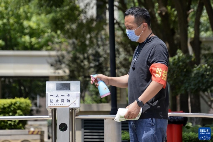 北京市大興區舊宮鎮的一名社區干部在為小區的入口設備消毒(2020年6月21日攝)。新華社記者 李欣 攝