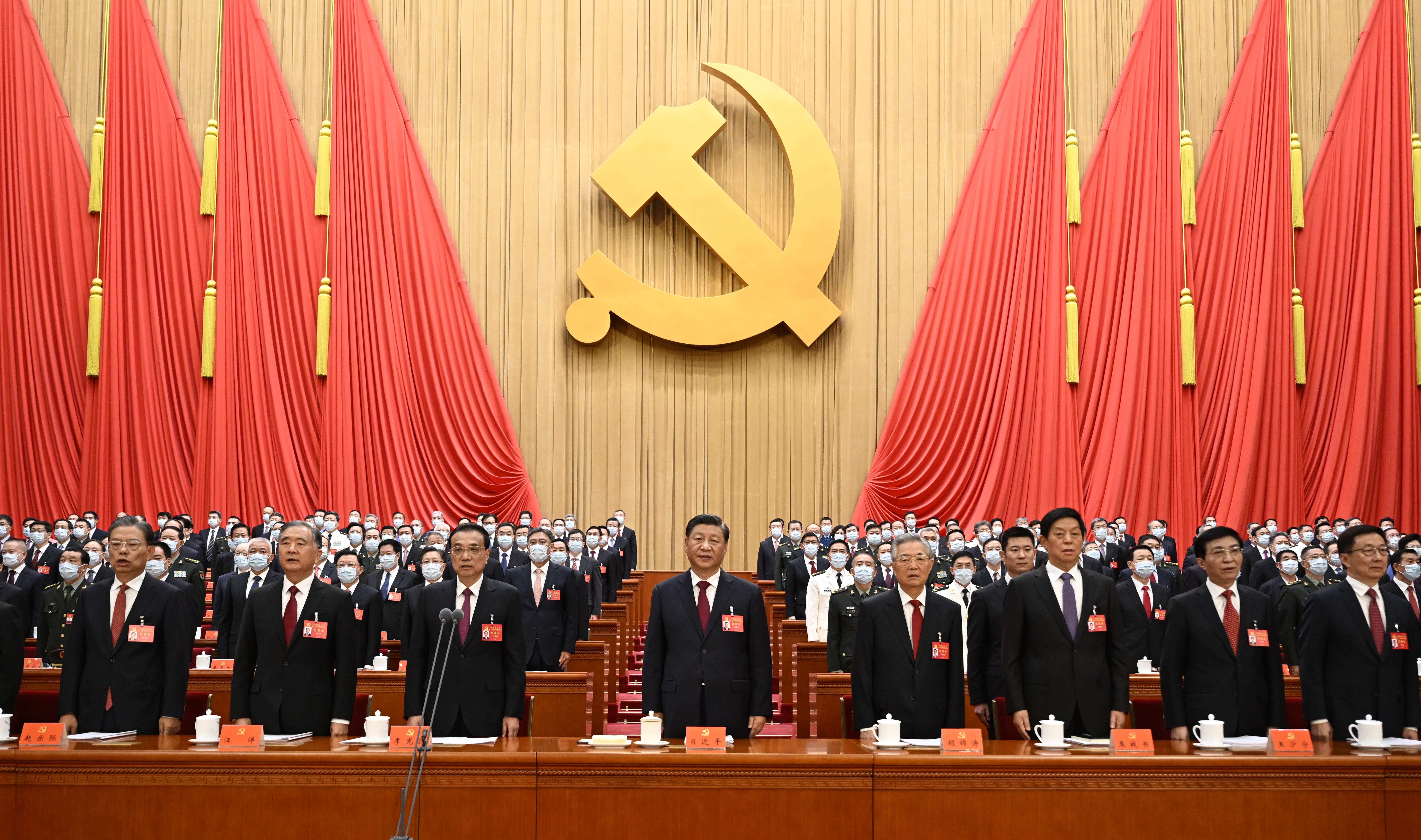 10月16日,中國共產黨第二十次全國代表大會在北京人民大會堂開幕。這是習近平、李克強、栗戰書、汪洋、王滬寧、趙樂際、韓正、胡錦濤在主席臺上。新華社記者 李學仁 攝